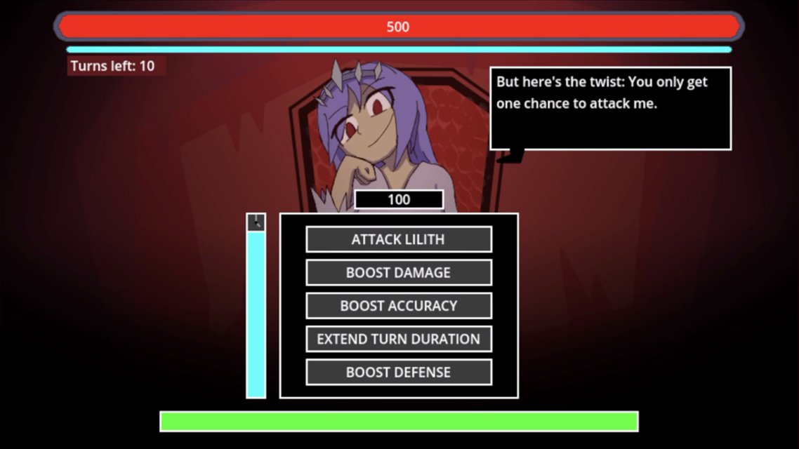 - During Lilith's turn, if she has enough energy, she will attack you. Survive the onslaught of attacks.